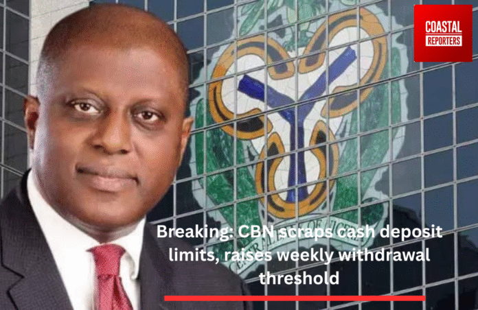 The Central Bank of Nigeria (CBN) has announced the removal of restrictions on cash deposits and an upward review of the weekly cash withdrawal limit to N500,000, up from N100,000.