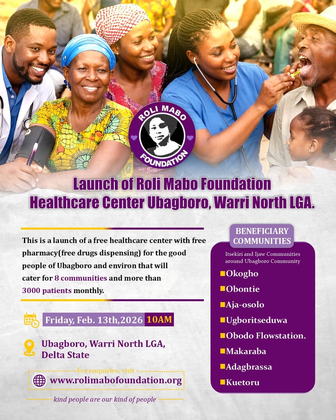 The Roli Mabo Foundation has announced the launch of a free healthcare center with a free pharmacy in Ubagboro, Warri North Local Government Area of Delta State, as part of its commitment to improving grassroots healthcare delivery.